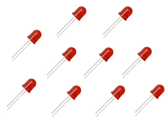 En uppsättning av 10 röda diffusa lysdioder med en diameter på 10 mm. Dessa lysdioder har en röd linsfärg och avger rött ljus med en våglängd på cirka 630nm. Vinkeln vid vilken ljuset sänds ut är ungefär 120°.