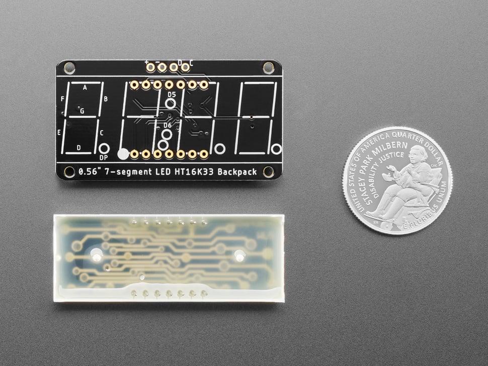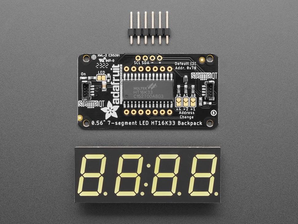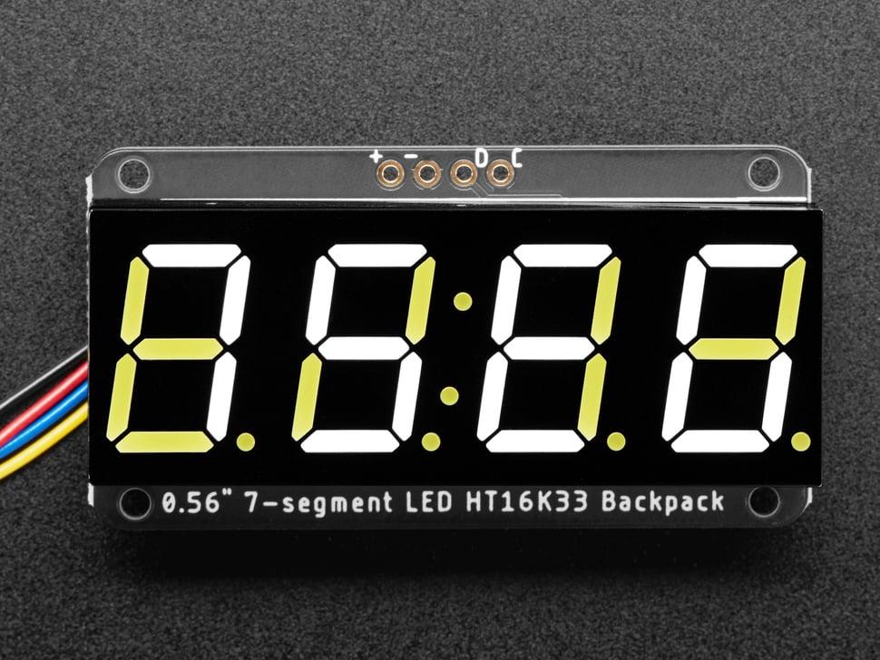 Satsen innehåller en fullt testad LED-ryggsäck, en 4-siffrig 0,56" hög vit sjusegmentsdisplay och en 4-polig header. Tack vare adressvalsbyglar kan du ansluta flera skärmar på en enda I2C-buss.